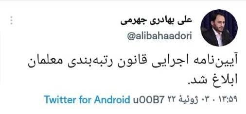 توریسم آنلاین: بهادری جهرمی در توییتی  از ابلاغ آیین نامه اجرایی قانون رتبه بندی معلمان خبر داد.