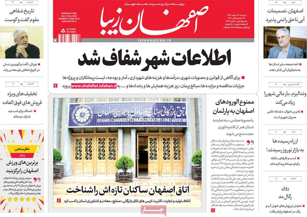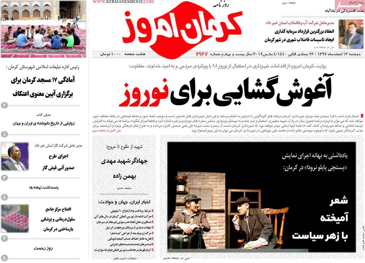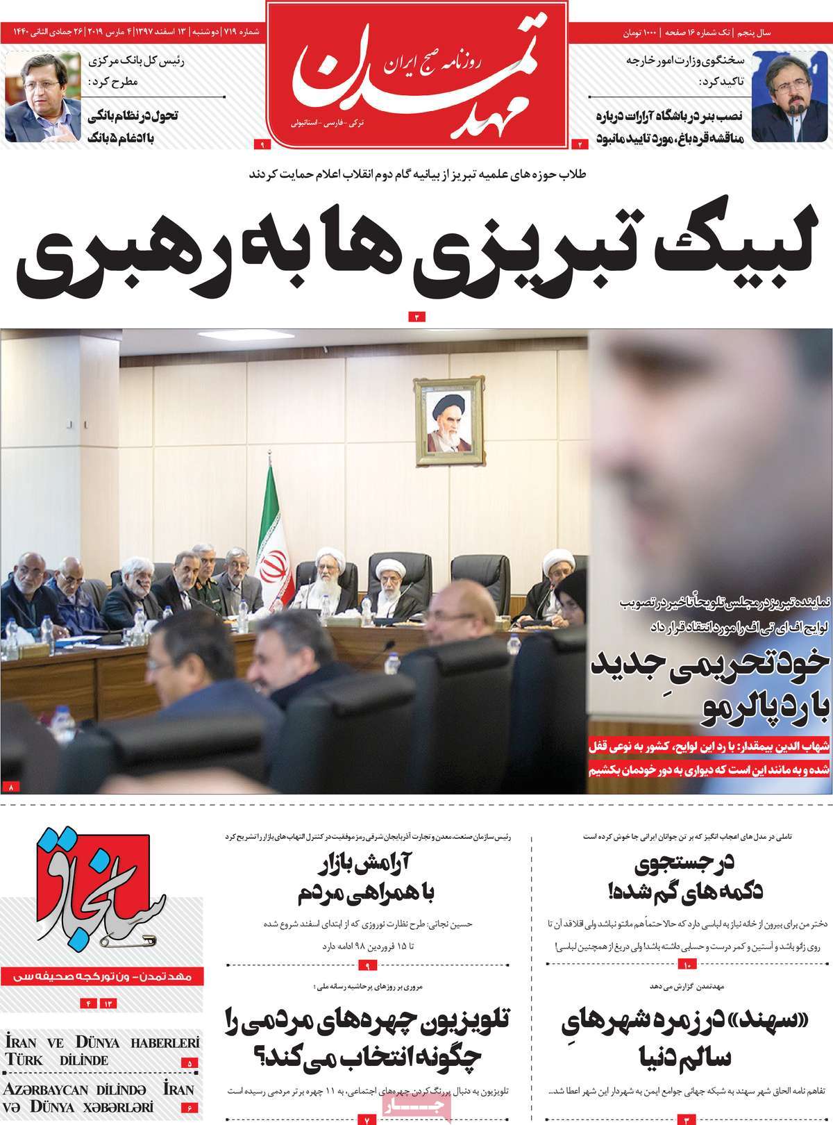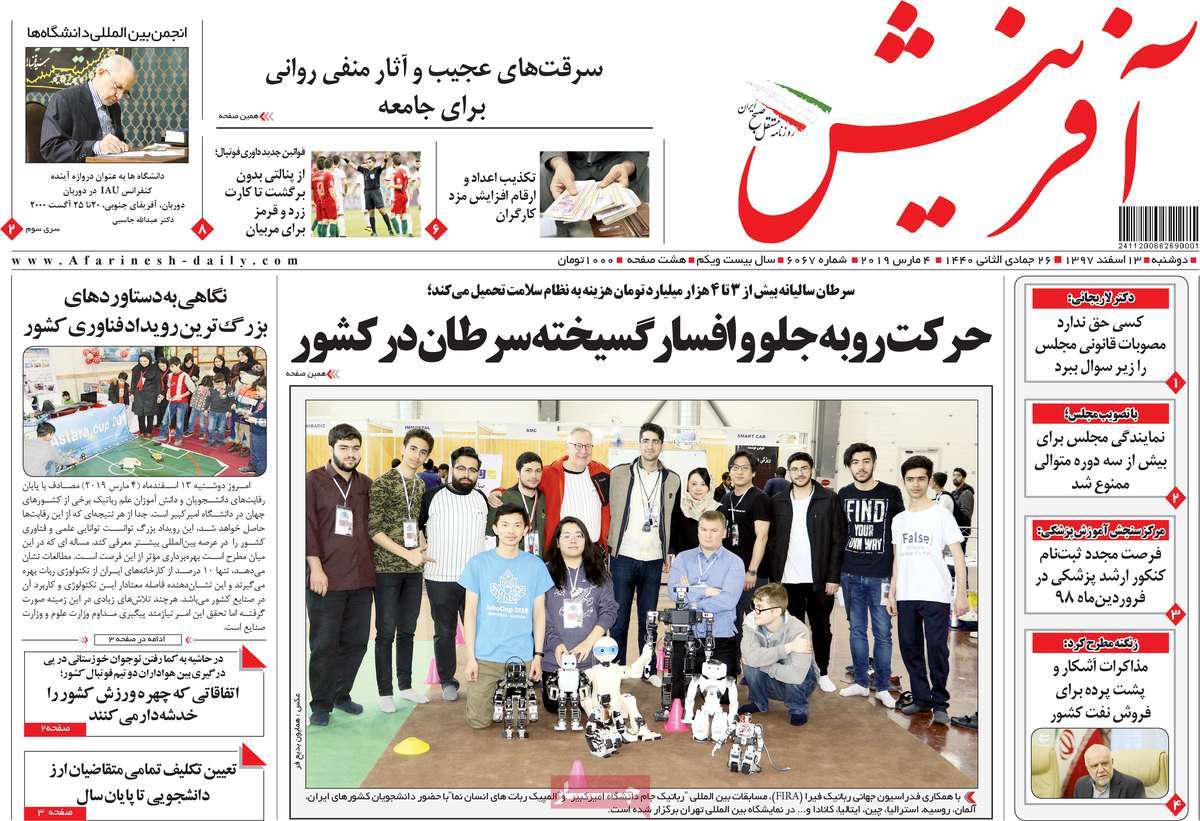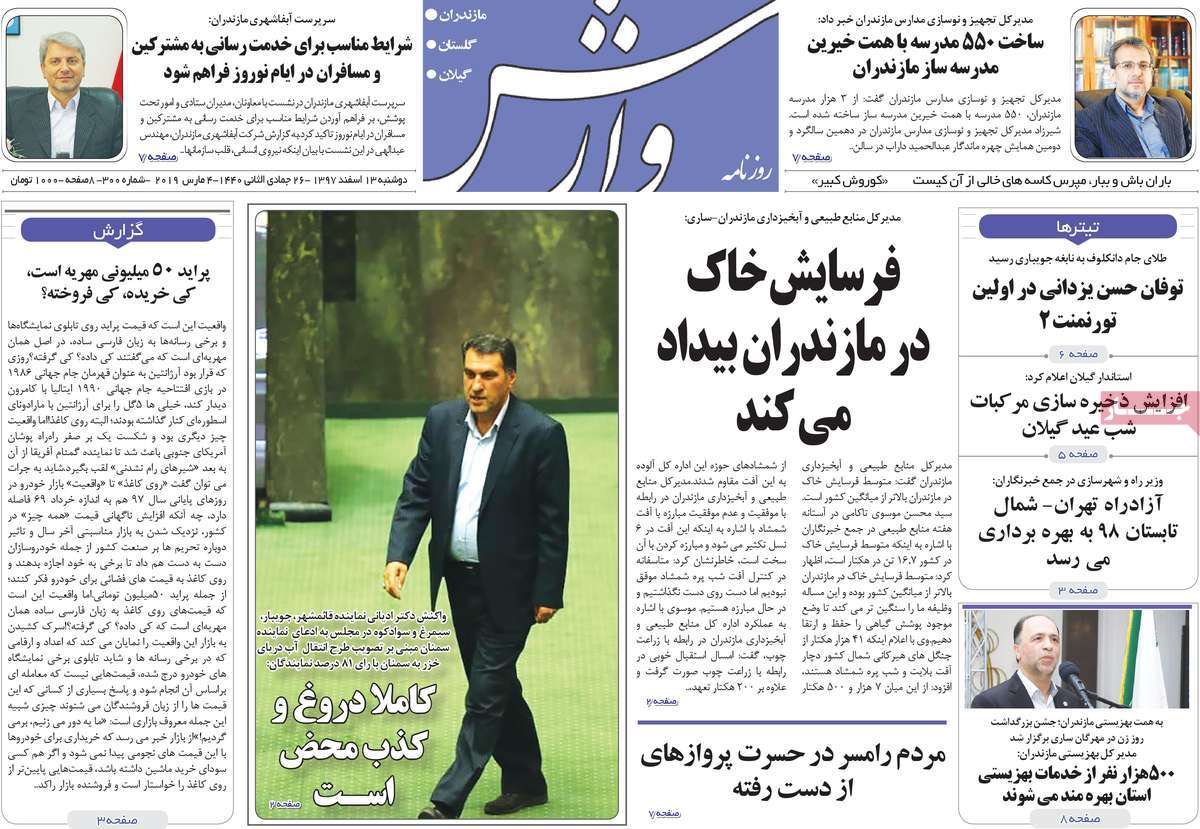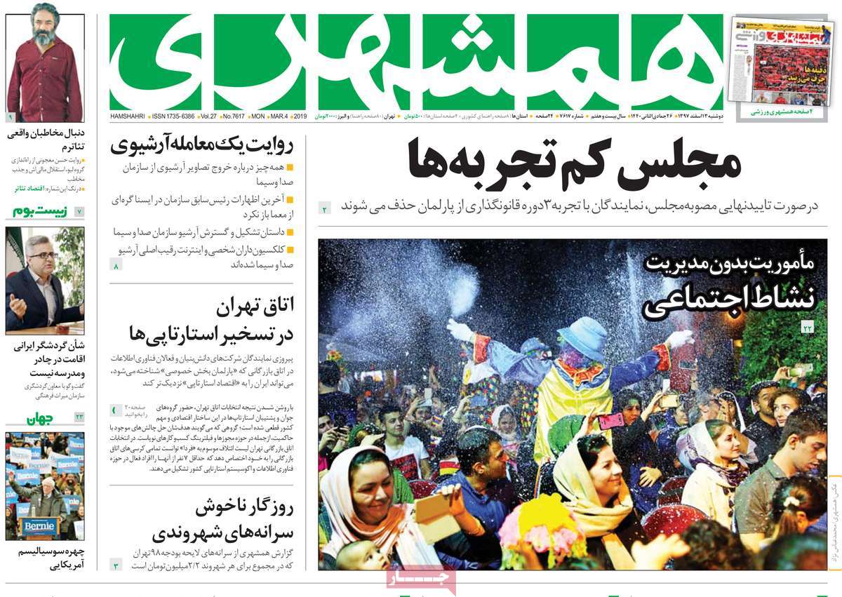 صفحه اول روزنامه های کشوری و استانی؛ دوشنبه ۱۳ اسفند ماه ۱۳۹۷ /تصاویر