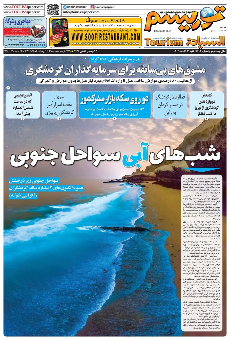 توریسم آنلاین: روزنامه توریسم درشماره امروز خودبه مشوق های سرمایه گذاری،گرانی بازار سفر،زیبایی فیتوپلانکتونپرداخته است.