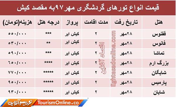 اقتصادآنلاین: قیمت انواع تورهای گردشگری به مقصد کیش در مهرماه۹۷ به شرح جدول زیر است؛