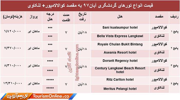 اقتصادآنلاین: قیمت انواع تورهای گردشگری ترکیبی به مقصد کوالالامپور و لنکاوی در آبان ماه۹۷ به شرح جدول زیر است؛
