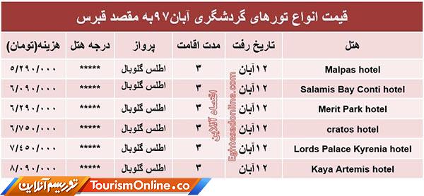 اقتصادآنلاین-مریم علیایی: قیمت انواع تورهای گردشگری به مقصد قبرس در آبان ماه۹۷ به شرح جدول زیر است؛