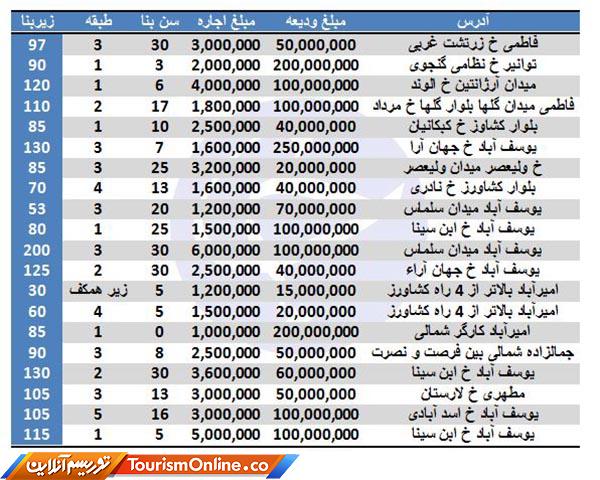 یک دستگاه آپارتمان ۸۰ متری واقع در یوسف آباد، خیابان ابن سینا با مبلغ ۱۰۰ میلیون تومان ودیعه و ماهانه یک میلیون و ۵۰۰ هزار تومان اجاره، معامله می‌شود.