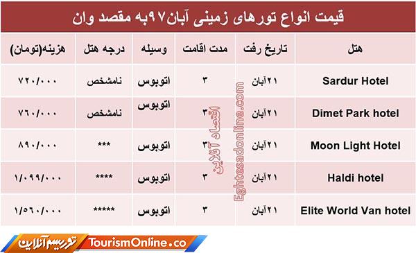 اقتصادآنلاین: قیمت انواع تورهای گردشگری به مقصد وان در آبان ماه۹۷ به شرح جدول زیر است؛