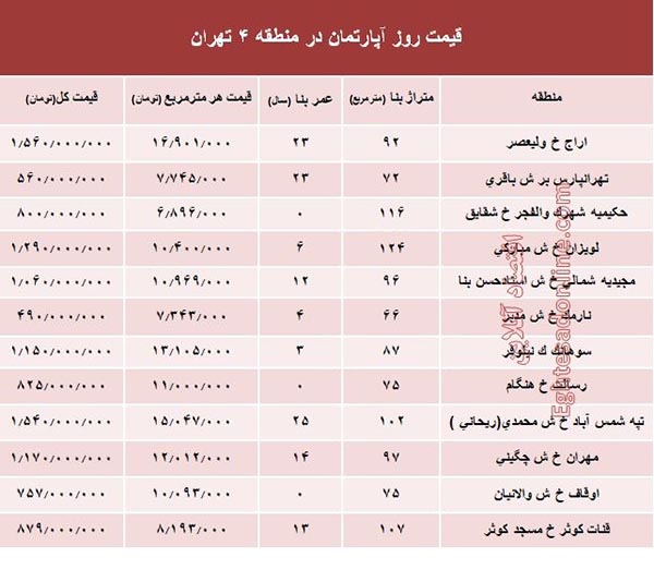 نرخ قطعی آپارتمان در منطقه ۴ تهران؟ +جدول