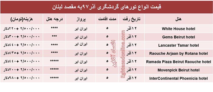 اقتصادآنلاین-مریم علیایی: قیمت انواع تورهای گردشگری به مقصد لبنان در آبان ماه۹۷ به شرح جدول زیر است؛