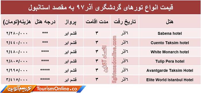 اقتصادآنلاین: قیمت انواع تورهای گردشگری به مقصد استانبول در آذر ماه۹۷ به شرح جدول زیر است؛