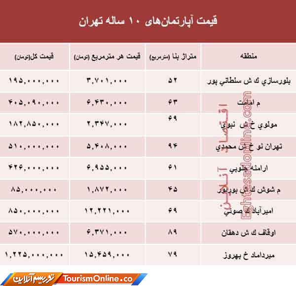 مظنه آپارتمان‌های ۱۰ ساله تهران +جدول