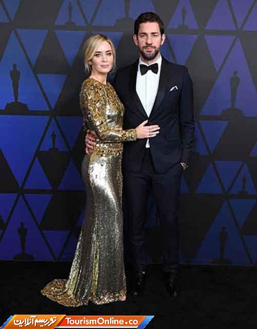 6. امیلی بلانت هنرپیشه هالیوود با نیم تنه و دامن کارشده در کنار همسرش جان کرازینسکی در این مراسم