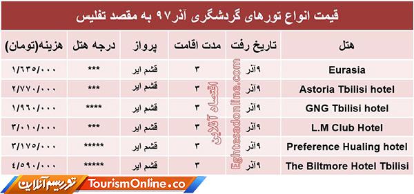 اقتصادآنلاین: قیمت انواع تورهای گردشگری به مقصد تفلیس در آذر ماه۹۷ به شرح جدول زیر است؛