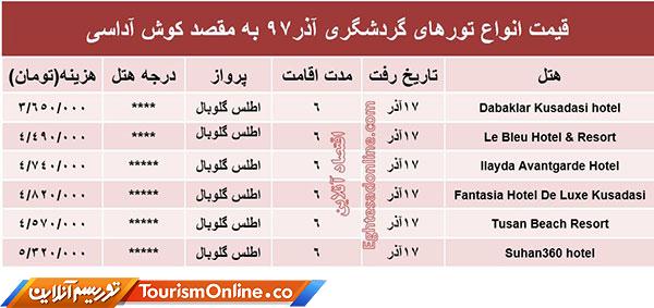 اقتصادآنلاین: قیمت انواع تورهای گردشگری به مقصد کوش‌آداسی در آذر ماه۹۷ به شرح جدول زیر است؛