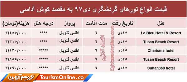 اقتصادآنلاین: قیمت انواع تورهای گردشگری به مقصد کوشآداسی در دی ماه۹۷ به شرح جدول زیر است؛