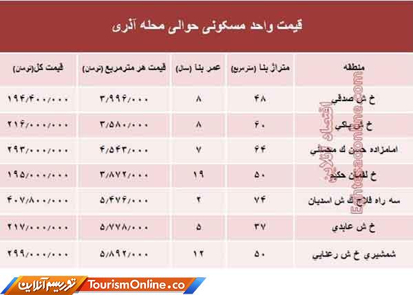 قیمت واحد مسکونی حوالی محله آذری؟ +جدول