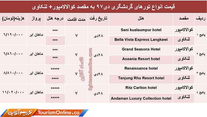 اقتصادآنلاین: قیمت انواع تورهای گردشگری به مقصد کوالالامپور و لنکاوی در دی ماه۹۷ به شرح جدول زیر است؛