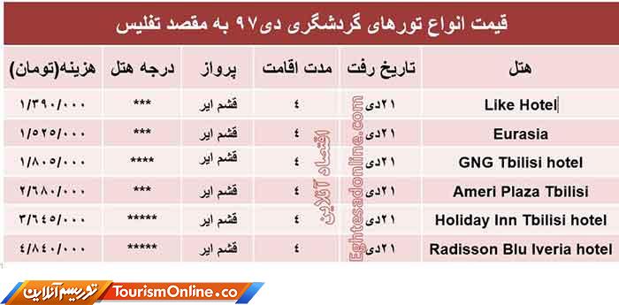 اقتصادآنلاین: قیمت انواع تورهای گردشگری به مقصد تفلیس در دی ماه۹۷ به شرح جدول زیر است؛