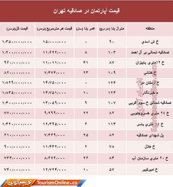 آپارتمان در منطقه صادقیه چند است؟ +جدول