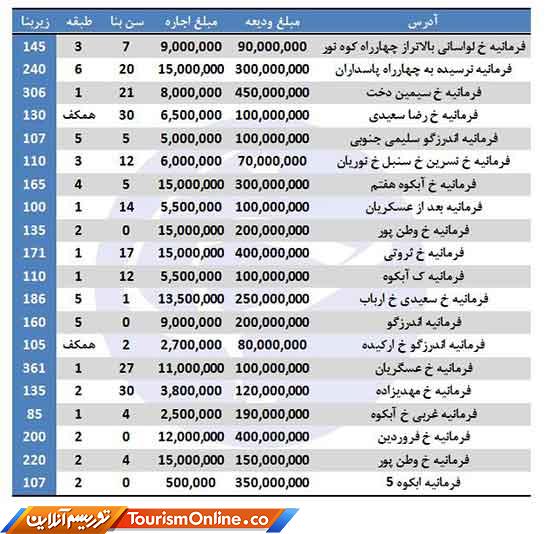 یک دستگاه آپارتمان ۲۰۰ متری واقع در فرمانیه، خیابان فروردین با مبلغ ۴۰۰ میلیون تومان ودیعه و ماهانه ۱۲ میلیون تومان اجاره، معامله می‌شود.