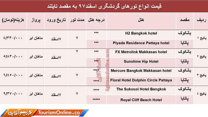 اقتصادآنلاین: قیمت انواع تورهای گردشگری به مقصد تایلند در اسفند ماه۹۷ به شرح جدول زیر است؛