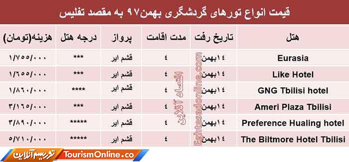 اقتصادآنلاین: قیمت انواع تورهای گردشگری به مقصد تفلیس در بهمن ماه۹۷ به شرح جدول زیر است؛