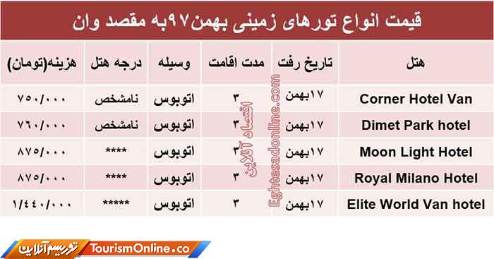 اقتصادآنلاین: قیمت انواع تورهای گردشگری زمینی به مقصد وان در بهمن ماه۹۷ به شرح جدول زیر است؛