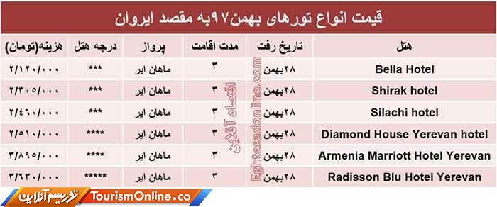 اقتصادآنلاین: قیمت انواع تورهای گردشگری به مقصد ایروان در بهمن ماه۹۷ به شرح جدول زیر است؛