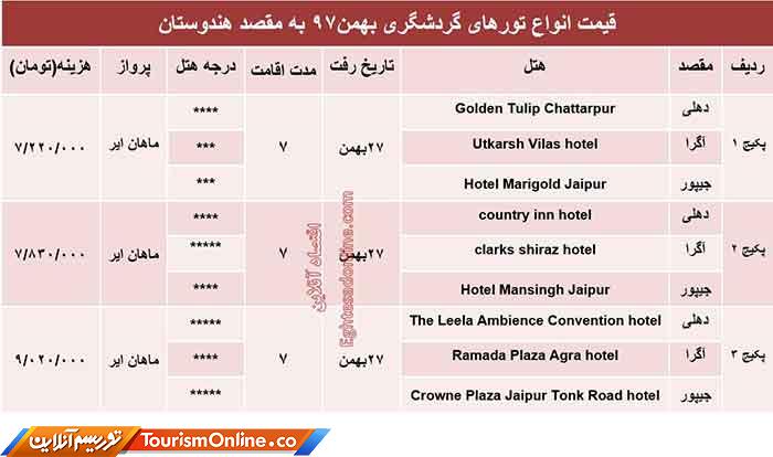 اقتصادآنلاین: قیمت انواع تورهای گردشگری به مقصد هندوستان در بهمن ماه۹۷ به شرح جدول زیر است؛