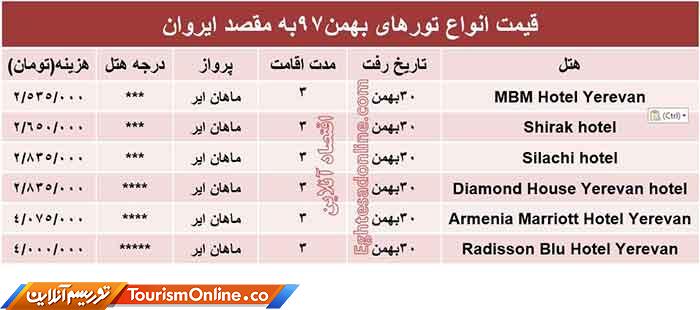 خانه/میراث فرهنگی و گردشگری/گردشگری/تور ۳روزه ارمنستان چند است؟ گردشگری تور ۳روزه ارمنستان چند است؟ 27 بهمن 13970 فیس بوک توییتر لینکدین پینترست اقتصادآنلاین: قیمت انواع تورهای گردشگری به مقصد ایروان در بهمن ماه۹۷ به شرح جدول زیر است؛ امتیاز کاربر: اولین نفر باشید ! برچسب هاایروان تورهای گردشگری تورهای گردشگری ایروان قیمت انواع تورهای گردشگری قیمت انواع تورهای گردشگری ترکیبی قیمت انواع تورهای گردشگری زمینی 27 بهمن 13970 فیس بوک توییتر لینکدین پینترست