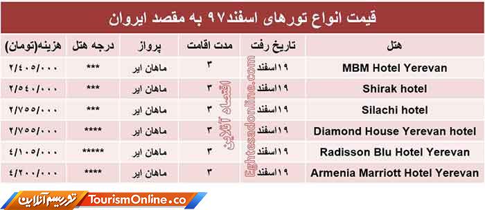 خانه/میراث فرهنگی و گردشگری/گردشگری/۳شب اقامت در ارمنستان چقدر هزینه دارد؟ گردشگری ۳شب اقامت در ارمنستان چقدر هزینه دارد؟ 11 اسفند 13970 فیس بوک توییتر لینکدین پینترست اقتصادآنلاین: قیمت انواع تورهای گردشگری به مقصد ایروان در اسفند۹۷ به شرح جدول زیر است؛ امتیاز کاربر: اولین نفر باشید ! برچسب هاانواع تورهای گردشگری انواع تورهای گردشگری ترکیبی تورهای گردشگری تورهای گردشگری ایروان تورهای گردشگری به مقصد ایروان قیمت انواع تورهای گردشگری زمینی 11 اسفند 13970 فیس بوک توییتر لینکدین پینترست