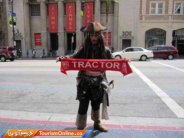 شخصی که شباهت عجیبی به جانی دپ بازیگر معروف سینمای جهان دارد با پرچم تراکتورسازی عکس یادگاری گرفته است.