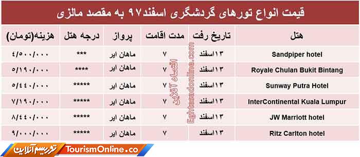 اقتصادآنلاین: قیمت انواع تورهای گردشگری به مقصد مالزی در اسفند۹۷ به شرح جدول زیر است؛