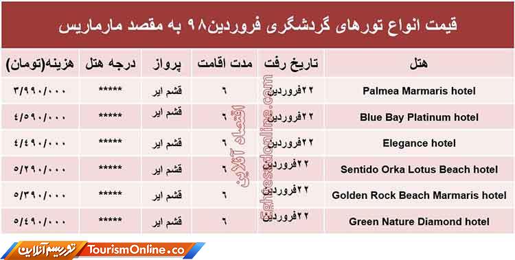 اقتصادآنلاین: قیمت انواع تورهای گردشگری به مقصد مارماریس در فروردین۹۸ به شرح جدول زیر است؛