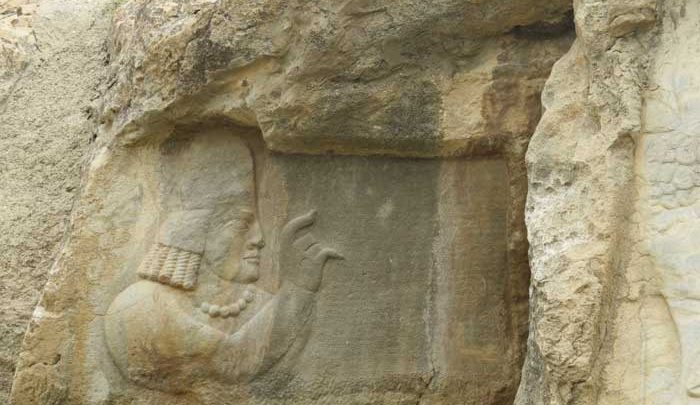 سر و بالاتنه شاه به جلو چرخیده و این بر خلاف رسم معمولی نقش های «ساسانی» است.