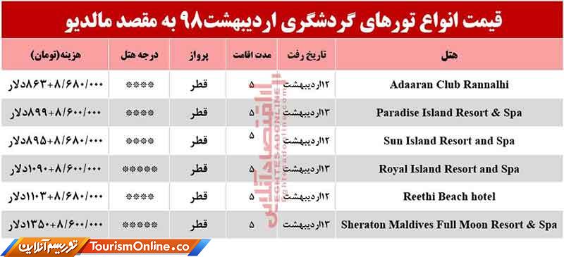 اقتصادآنلاین: قیمت انواع تورهای گردشگری به مقصد مالدیو در اردیبهشت۹۸ به شرح جدول زیر است؛