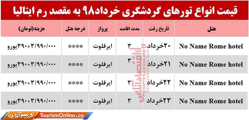 اقتصادآنلاین: قیمت انواع تورهای گردشگری به مقصد رم ایتالیا در اردیبهشت۹۸ به شرح جدول زیر است؛
