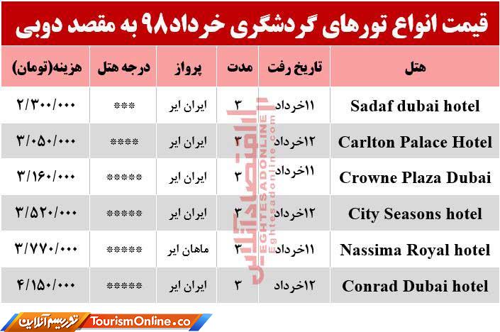 اقتصادآنلاین: قیمت انواع تورهای گردشگری به مقصد دوبی در خرداد۹۸ به شرح جدول زیر است؛
