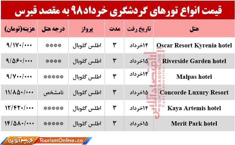 اقتصادآنلاین: قیمت انواع تورهای گردشگری به مقصد قبرس در خرداد۹۸ به شرح جدول زیر است؛