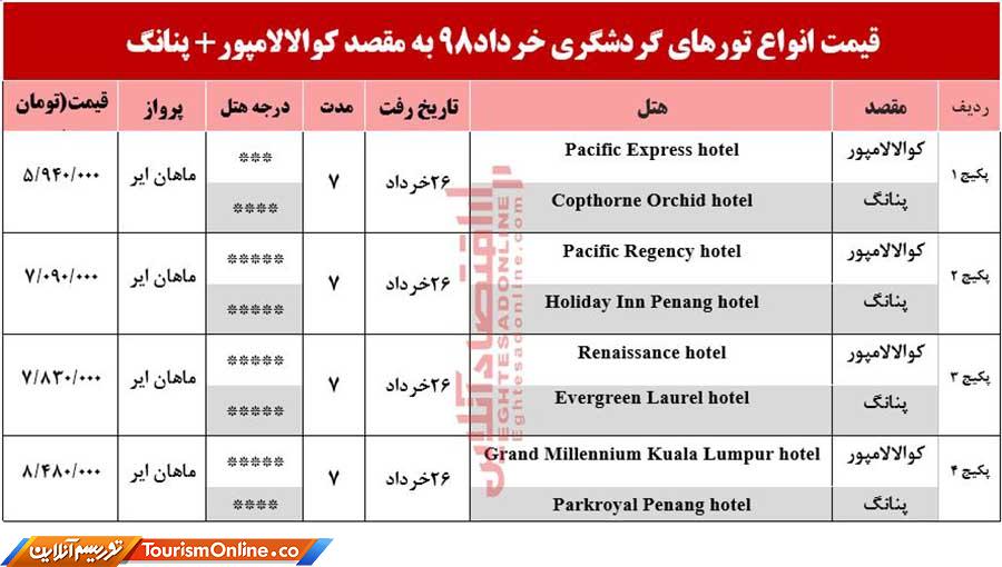 اقتصادآنلاین-: قیمت انواع تورهای گردشگری به مقصد کوالالامپور و پنانگ در خرداد۹۸ به شرح جدول زیر است؛