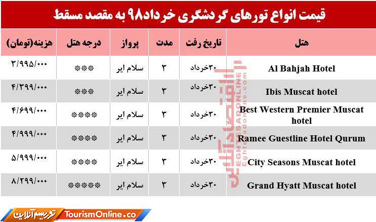 اقتصادآنلاین: قیمت انواع تورهای گردشگری به مقصد مسقط عمان در خرداد۹۸ به شرح جدول زیر است؛