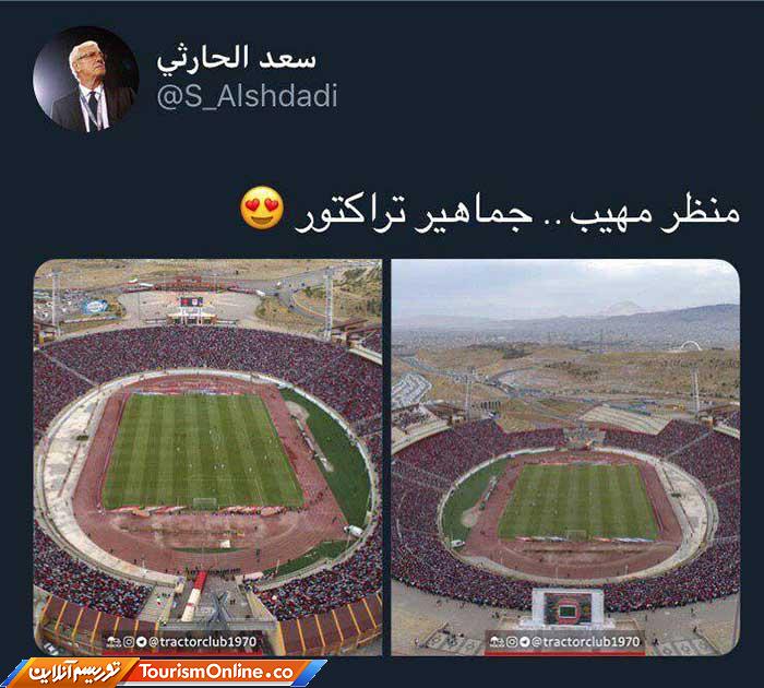 به گزارش«توریسم آنلاین» سعد الحارثی خبرنگار عربستانی که سابقا عضو کمیته رسانه ای “ای اف سی” نیز بوده با انتشار دو عکس هوایی از ورزشگاه یادگار امام تبریز نوشت:نمای باشکوه؛ هواداران تراکتور.