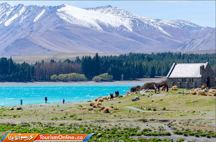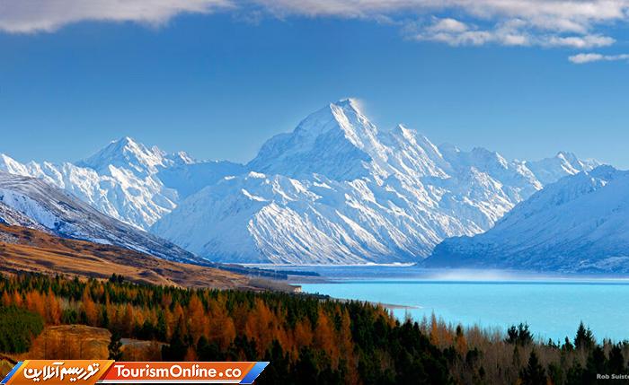 دریاچه پوکاکی یک جواهر آبی رنگ درخشان با پس زمینه کوه کوک (آئوراکی) در نیوزیلند است.