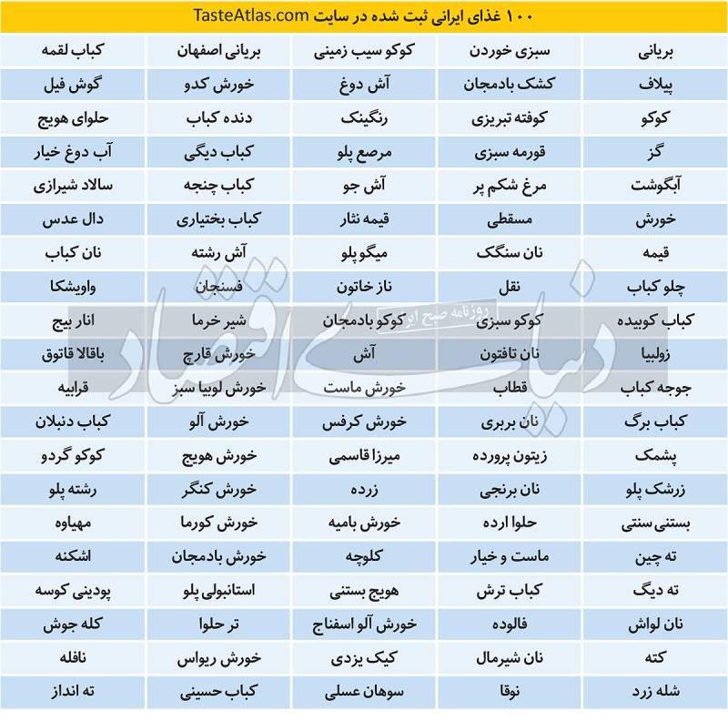 سایت اطلس جهانی غذا، لیستی از 100 غذای خوشمزه ایرانی برای جذب توریست را منتشر کرده است.