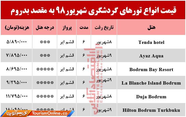 خانه/میراث فرهنگی و گردشگری/گردشگری/سفر به بدروم ترکیه چقدر هزینه دارد؟ گردشگری سفر به بدروم ترکیه چقدر هزینه دارد؟ 3 شهریور 13980 فیس بوک توییتر لینکدین پینترست اقتصادآنلاین: قیمت انواع تورهای گردشگری به مقصد بدروم در شهریور۹۸ به شرح جدول زیر است؛ امتیاز کاربر: اولین نفر باشید ! برچسب هابدروم قیمت انواع تورهای گردشگری قیمت انواع تورهای گردشگری به مقصد بدروم قیمت انواع تورهای گردشگری وان 3 شهریور 13980 فیس بوک توییتر لینکدین پینترست