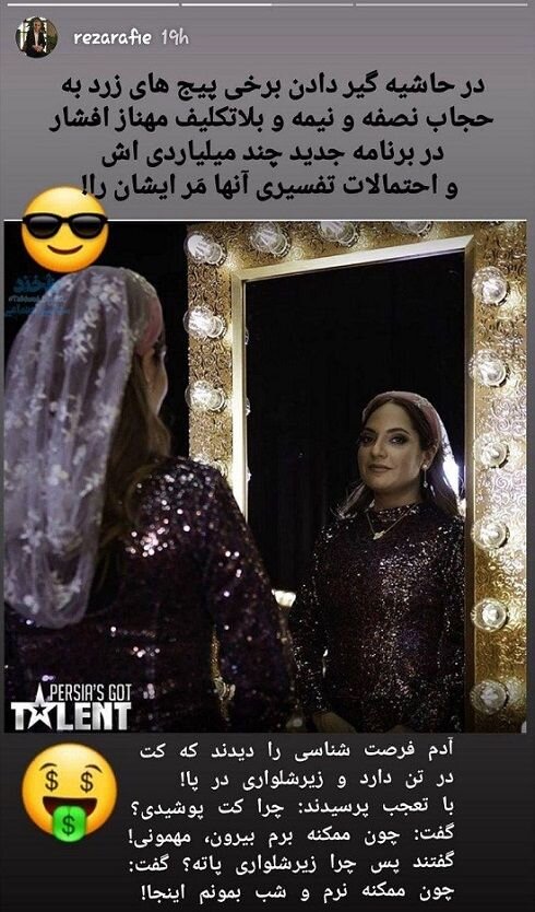 رضا رفیع، مجری و طنزپرداز صدا و سیما با انتشار استوری در اینستاگرام خود به حجاب نصف و نیمه و بلاتکلیف مهناز افشار در خارج از کشور واکنش نشان داد.