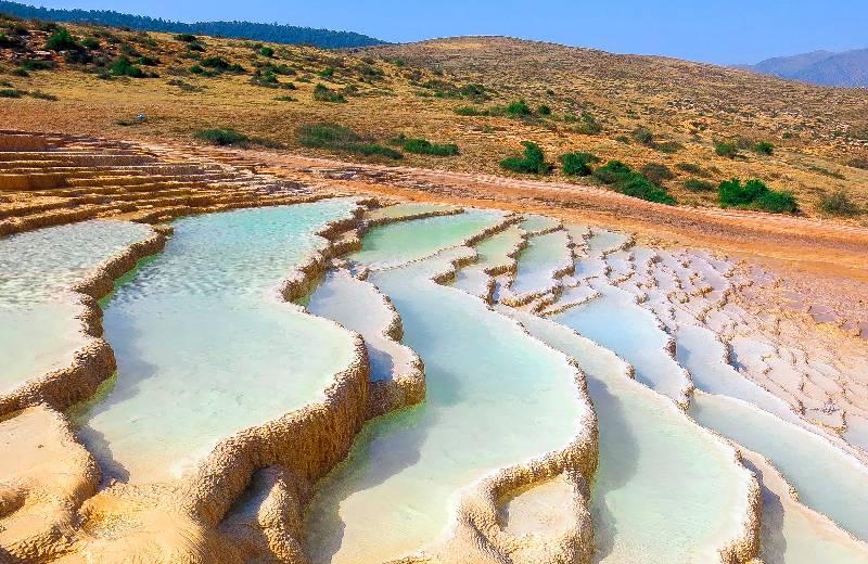 باداب سورت است و پله‌هایی رنگین که هر کدام حوضچه‌ای پر از آب تشکیل داده‌اهند؛ حوضچه‌هایی کوچک و بزرگ با تصویری از آسمان. آبی که از چشمه‌های تراورتن ساز بالادست در طی سال‌ها به سوی پایین دامنه‌ی کوه جریان یافته، سبب تشکیل پله‌های رسوبی شده است.