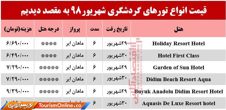 اقتصادآنلاین: قیمت انواع تورهای گردشگری به مقصد دیدیم در شهریور۹۸ به شرح جدول زیر است؛