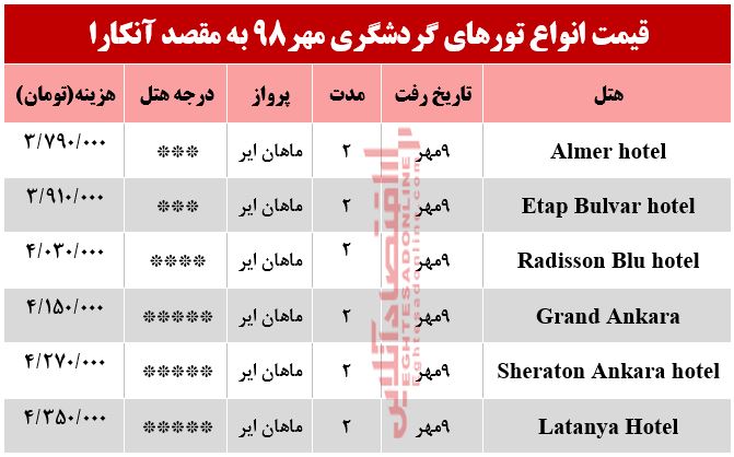 خانه/اقتصادی/اقتصاد گردشگری/تور آنکارا چند تمام میشود؟ اقتصاد گردشگریسفر خوش...! تور آنکارا چند تمام میشود؟ 9 مهر 13980 فیس بوک توییتر لینکدین پینترست اقتصادآنلاین: قیمت انواع تورهای گردشگری به مقصد آنکارا در مهر۹۸ به شرح جدول زیر است؛ امتیاز کاربر: اولین نفر باشید ! برچسب هاآنکارا انواع تورهای گردشگری قیمت انواع تورهای گردشگری آنکارا گردشگری 9 مهر 13980 فیس بوک توییتر لینکدین پینترست