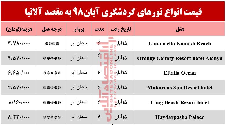 اقتصادآنلاین: قیمت انواع تورهای گردشگری به مقصد آلانیا در آبان۹۸ به شرح جدول زیر است؛