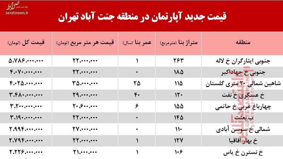قیمت آپارتمان در منطقه جنت آباد/جدول