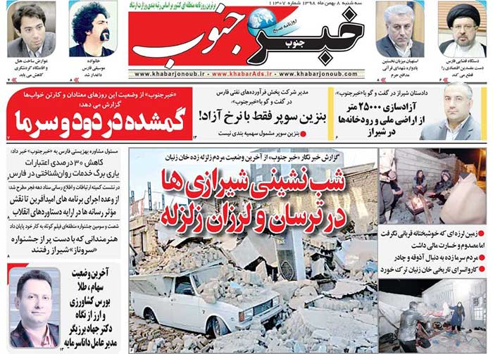 صفحه اول بخش جنوب روزنامه خبرجنوب امروز به زلزله دیروز شیراز اختصاص دارد.