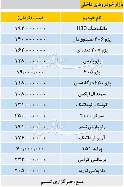 دنیای اقتصاد در جدولی قیمت انواع خودروهای داخلی را اعلام کرد.جدول زیر در بردارنده قیمت برخی خودروهای داخلی است.